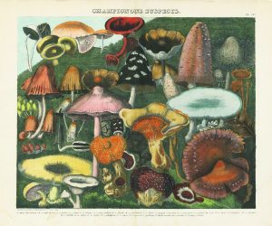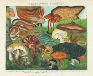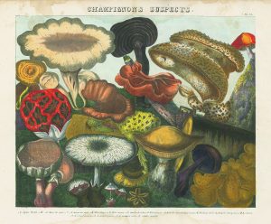 Hand-colored chromolithographs by A. Cornillon depict a range of mushrooms, some varieties familiar and others rare, including orange lion’s mane and chanterelles. These are published in Michel Étienne Descourtilz’s Atlas des champignons: comestibles, suspects et vénéneux.