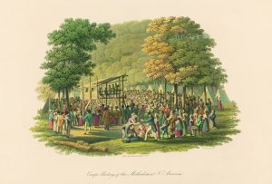 Camp meeting of the Methodists in North America, c. 1819; engraving by Jacques Gérard Milbert, 1766–1840. Courtesy the Library of Congress.