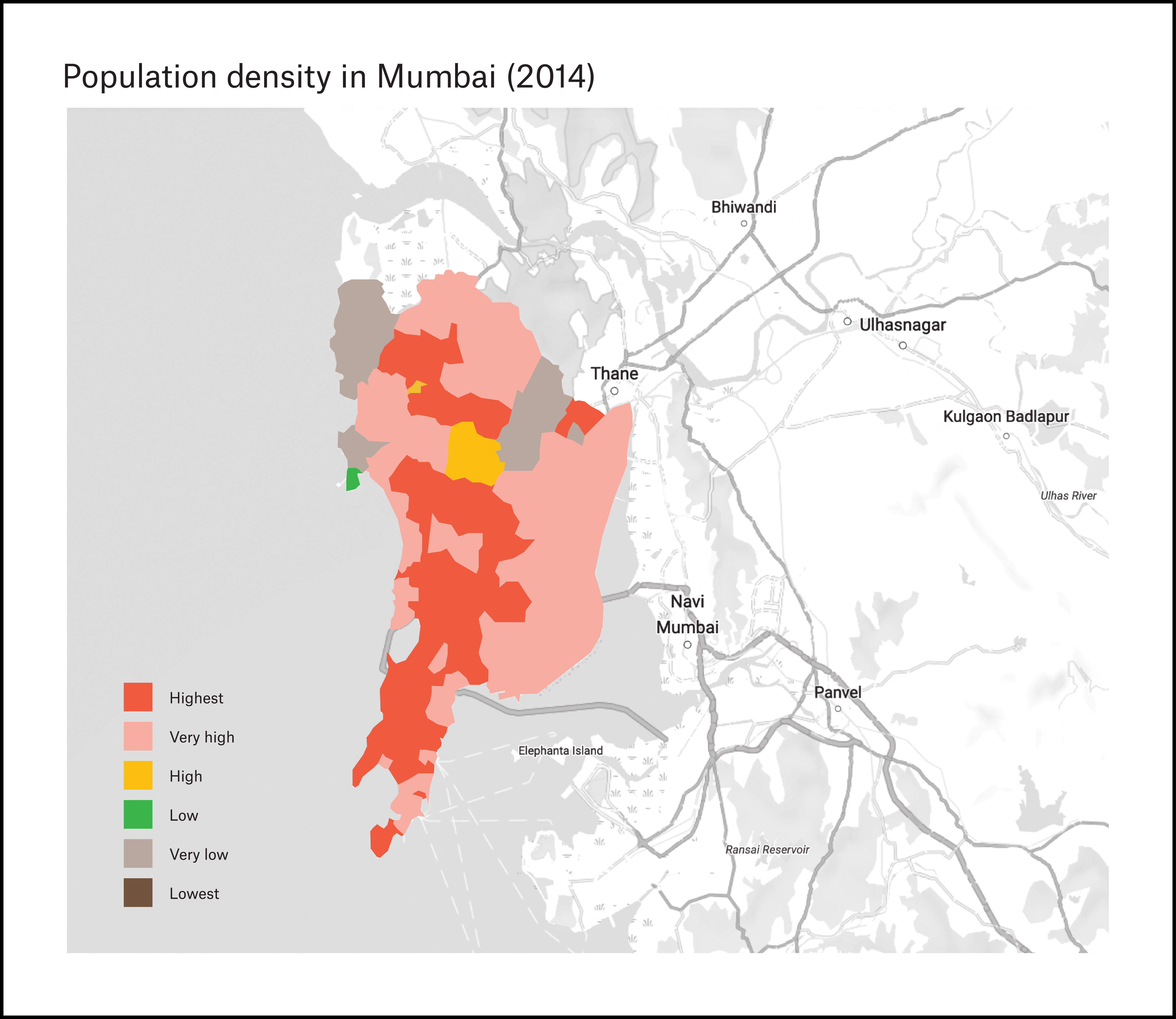 Compared to NYC’s 531 square feet per person, Mumbai’s residential density sits at less than 90 square feet per person.