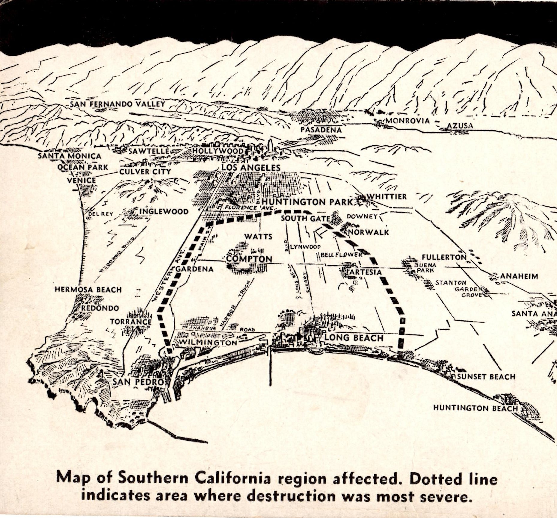 Map of the destruction zone of the 1933 Long Beach earthquake from a souvenir booklet that was published shortly afterwards. Courtesy Flickr.