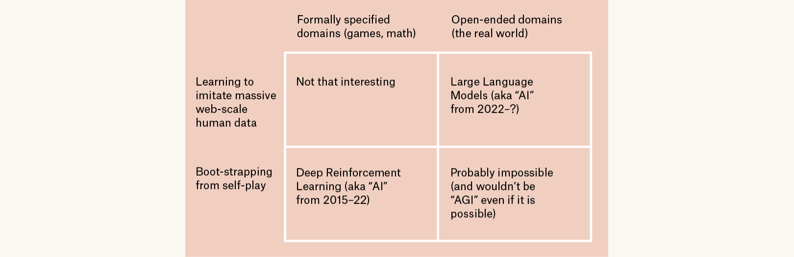 David Pfau, a researcher at DeepMind, illustrates this concept with a 2 x 2 diagram (above). According to Pfau’s (slightly snarky) diagram, there are only a few ways to massively scale up machine learning. One can bootstrap learning by self-play — a training method where AIs improve their performance at competitive games by pitting multiple instances of the same AI model against each other and adopting the most successful strategies. This is the method behind DeepMind’s AlphaGo and later AlphaZero, a more general game AI, which mastered Go, shogi, and chess. This can lead to superhuman performance, but it works only in limited, closed domains, like games, which mostly aren’t that interesting. Or one can learn to imitate human behavior from massive datasets generated from the real world (i.e., the entire internet). This is the approach that’s given us Claude and ChatGPT. However, large language models currently don’t have a way to leverage bootstrapping from self-play in open-ended domains, because they lack a clear source of ground truth. Pfau therefore doesn’t think LLMs will lead to artificial general intelligence. But math is, again, the exception — a closed domain with a source of ground truth on which one can both bootstrap from self-play and leverage massive data. (I would also add, as a mathematician, that it is inherently interesting.)