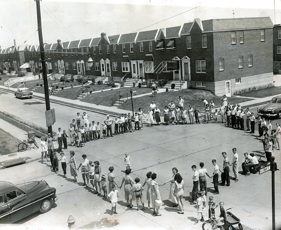 Mothers join hands with their children to block the intersection of Hellerman and Walker Streets in a plea for a stop sign on Hellerman Street after a woman was killed in an auto crash at the scene. Published in the Philadelphia Evening Bulletin. Courtesy Temple University Libraries.