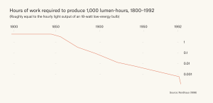 Moreover, looking solely at the technological change actually understates the extent of the economic improvement. To gauge the real price of lighting, Nordhaus compared lighting efficiency to the cost of labor. In 1800, it took 5.4 hours of labor for the average worker to afford 1,000 lumen-hours — roughly the 18-watt bulb emits for an hour. By 1890, with the widespread adoption of electricity, this price had dropped to 0.133 hours. In 1992, when Nordhaus, this had dropped to 0.00012 hours — a 45,000-fold decrease in the real cost of lighting.