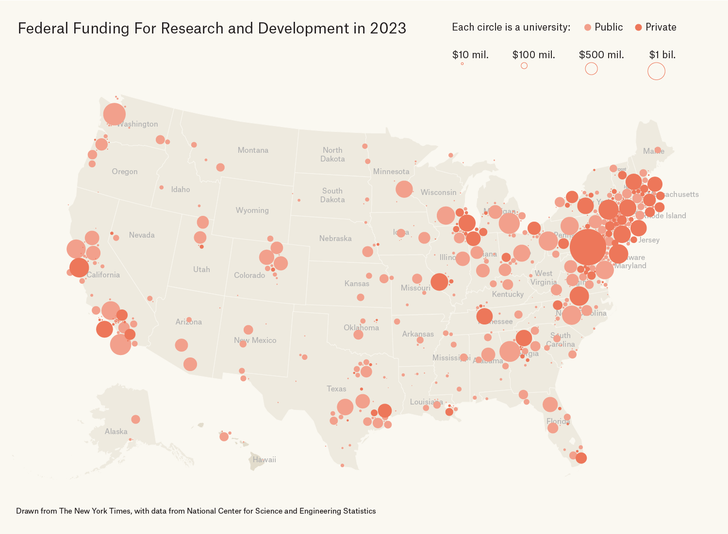 While a large proportion of federal research dollars flow to the typically more liberal states on the coasts, there is still substantial federal R&D spending that goes to universities in red states, including for instance Georgia Tech, Vanderbilt, the University of Florida, MD Anderson Cancer Center in Houston, the University of Texas, the University of Utah, and more. Florida State University, for instance, has announcedthat it is facing grant and contract cancellations of $102 million, and that “it is impossible for us to completely fill the gaps.”