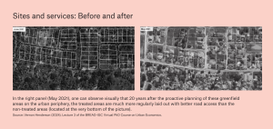 Similar approaches throughout urban history back up these results from Ethiopia. In the 1970s and ’80s, for example, the World Bank implemented a program called Sites and Services that proactively installed basic infrastructure (roads and rudimentary water mains) in greenfield areas on the fringes of fast-growing developing-world cities. A recent study by Michaels et al. (2021) on a Sites and Services program in several Tanzanian cities showed four to five decades later that the areas treated with this UX-esque intervention had higher-quality housing, improved electricity connectivity, and better access to water mains and roads. Moreover, these upfront investments crowded in significant private sector investment. And importantly, in the cash-constrained environment of African cities, the increase in land values arising from Sites and Services plots paid for the program’s costs multiple times over.11