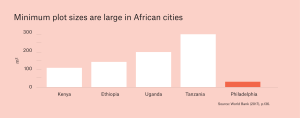 Until 2018, the minimum plot size in Dar was set at 400 square meters, over 10 times that of Philadelphia when it was being rapidly settled.7
