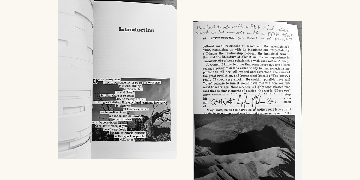 The poem was an exercise in sacralizing physical texts, a call-back to the pastiche technique of the Medium is the Massage record. Andrew began with a full page of text from a random book, then cut away most of the page, excavating a new text, his poem, from the old one. He then pasted it onto a picture.