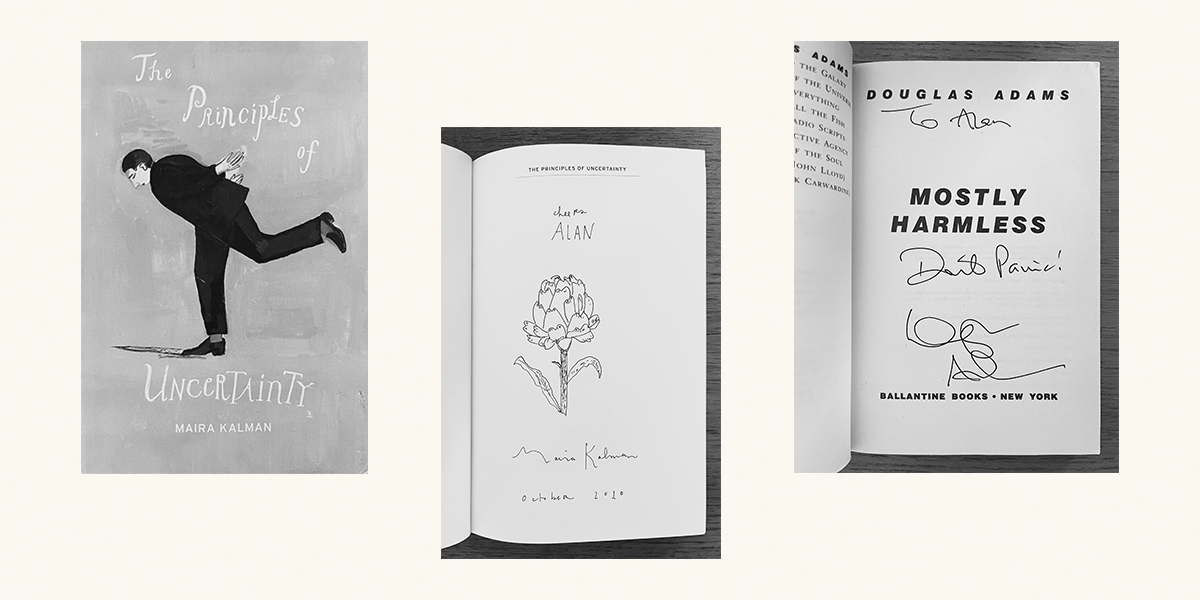And so it is that my signed paperback copy of Douglas Adams’ Mostly Harmless — “To Alan, Don’t Panic! Douglas Adams” — whisks me backwards 31 years, and suddenly I’m thirteen with my best friend in the back of his family’s Mercedes, his mother swerving around cars at top speed, holding a giant wired carphone (so cool!) in one hand, begging the bookstore to ask Douglas Adams to please stay just a bit longer because she’s gotten caught in traffic, and yes she knows the talk has ended, but these boys will be just devastated, and minutes later staring up at my hero, a gentle giraffe of a man, who grins and graces my book with the most famous phrase he’s written, knowing that for the last fifteen minutes we’d been panicking like crazy.