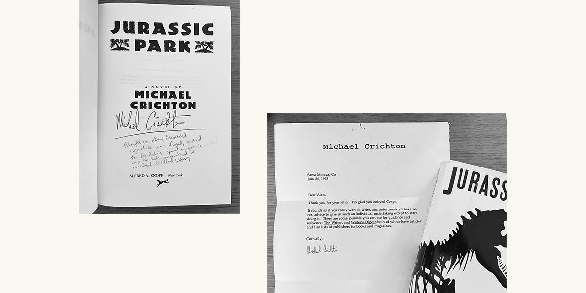 Busted and reported: eBay ended their account, refunded my money, and told me I could keep the Jurassic Park with the forged signature. I knew exactly what to put inside it to banish the demon: a precious letter, on Michael Crichton’s letterhead, written to twelve-year-old me! I’d written to him, asking for advice on becoming a writer. His honest answer: “Start doing it.” The authentic signature on that letter sits next to the fake one, along with a note I made in light pencil telling the story of the book.