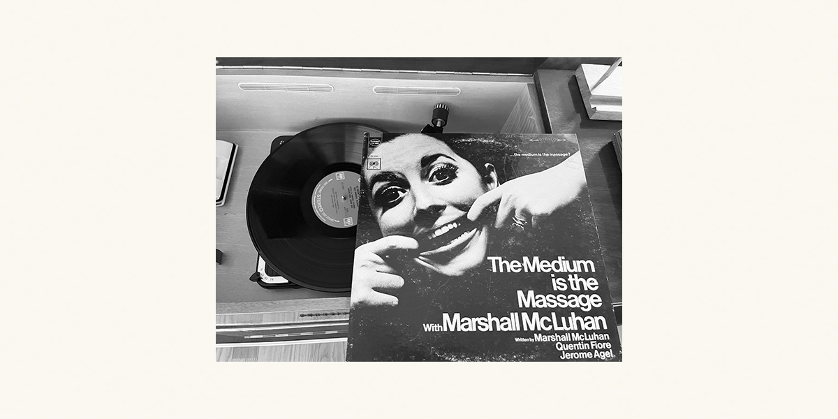 Far from romanticizing old media, McLuhan embraced the technology of his day. His book was an avant-garde pastiche of fonts, photos, and aphorisms. Who was this guy? I discovered he’d come out with an “audio” version of the book — not an audiobook, but a manic pastiche of music and soundbites, produced by John Simon (who also produced Leonard Cohen’s debut album — a Canada connection!) and released as an album in 1967 by Columbia. Making it relied on cutting edge technology, quite literally: They had to cut, paste, and layer strips of audio-tape to create the experience, which at the time could not be replicated in a different medium. Astonishingly, it sold well. Radio DJs played it regularly. I bought the record and listened to it while working on this essay. The paradox was intense: deliberately cutting edge tech from the past, transformed by time into a nostalgic physical object.