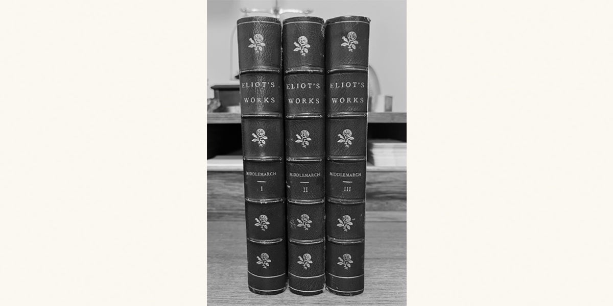 Mindful care and effort create meaning. The ritual of splitting those folds, over and over, established a personal relationship between me and Middlemarch. It invested those three volumes with an aura, further strengthened by the respect I extended to the delicate Morocco leather binding. I took care when sliding the volumes in and out of my bag. I checked that tables and counters were clean before I put the books down. I made a sacrifice — my time, my attention — and in doing so cast a spell of significance, not unlike that which infuses a handwritten note or a homecooked meal.