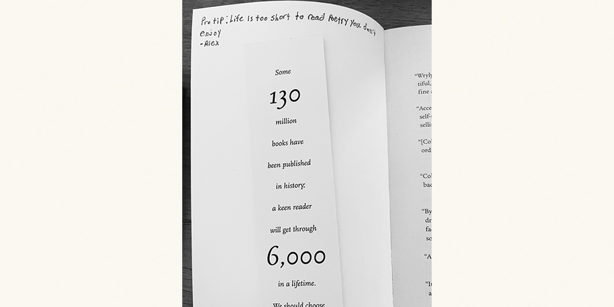 I kept the book. I enjoy the poems nearly as much as those in Picnic, Lightning. But even more important is the energy of Alex’s spell, which, as I said, changed me completely. No longer do I finish books just to finish them. This accidental incantation freed me to put a book aside with no guilt. Whenever I falter in my resolve, permission pulses out from the spine of that book on my shelf. The spell is stronger now, since I happened to find a bookmark that reflects the same sentiment, placing it alongside Alex’s advice.